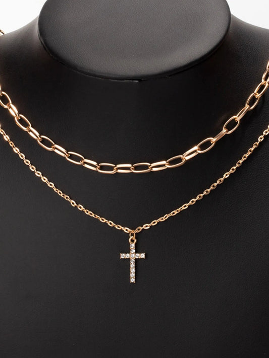 Double Layered Inlaid Zircon Cross Pendant Necklace